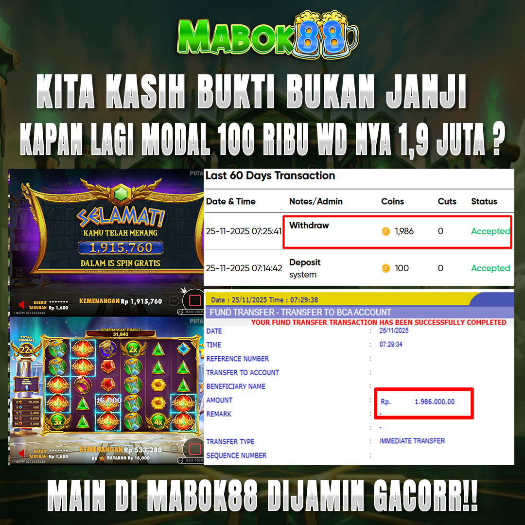 Gabung bersama SURGAWIN288 dan Dapatkan kesempatan jackpot sensasional dalam 15 menit seperti bukti banner ini bukan sekedar janji hanya Depo 100k Withdraw 1,9+ juta hari ini.